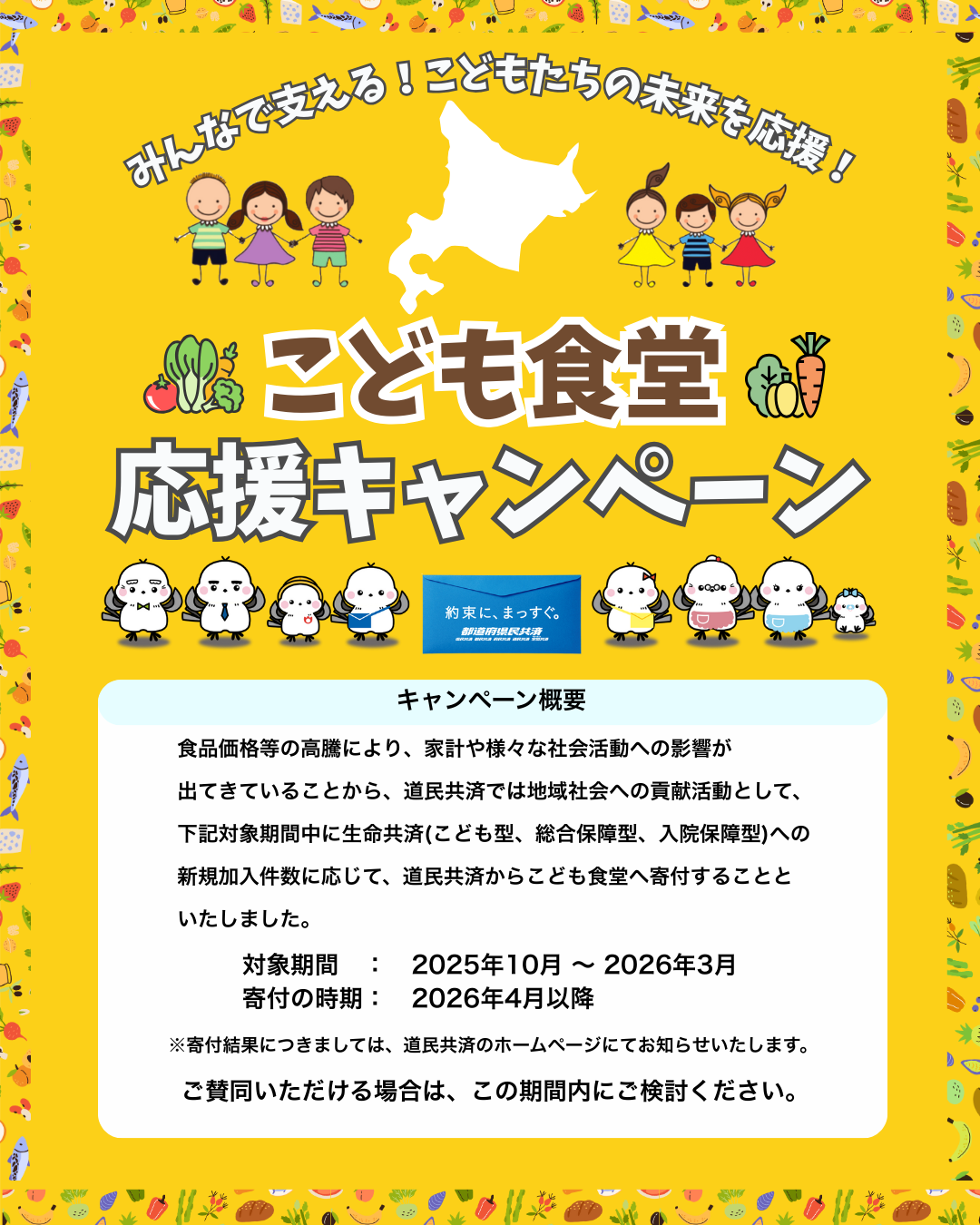 食品価格等の高騰により、家計や様々な社会活動への影響が出てきていることから、道民共済では地域社会への貢献活動として、下記対象期間中に生命共済(こども型、総合保障型、入院保障型)への新規加入件数に応じて、道民共済からこども食堂へ寄付することといたしました。